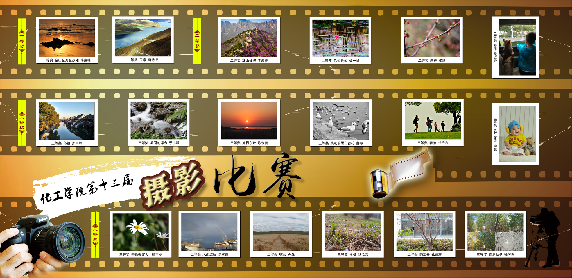 本次摄影比赛特聘请档案馆副馆长靳国栋老师担任评委,经层层筛选评比,最终评选出一等奖2名:玉带(唐艳凌)、金山金海金沙滩(李庶峰));二等奖4名:珠山杜鹃(李彦鹏)、你侬我侬(杨一帆)、新芽(张颖)、陪伴(段红玲);三等奖12名:乌镇(孙卓辉)、凝固的瀑布(于小斌)、旭日东升(涂勇善)、跳动的黑白音符(薛慧)、春游(祁传杰)、笑不露齿(李慧)、辛勤的采蜜人(韩丰磊)、风雨过后(陈翠霞)、收获(卢磊)、生机(魏孟吉)、鹊之喜(孔德辉)、春夏秋冬(孙昱东);优秀奖19名;化工系、学院办公室获评优秀组织奖。部分获奖作品已经制作成了展板在学院内部进行展示。