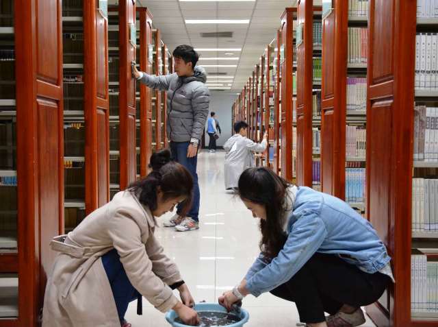 上午九点,化能学联主席团及24位入党积极分子在校图书馆一楼集合,此次志愿服务的地点是一楼文艺书库。全体人员按班级分组,在管理员阿姨的指导下,对书库内的110个书架,共880层图书隔间进行整理与清洁。同学们分工合作,整理与清洁工作快速且有序的进行着。学联主席房星辰除了协调调度,还负责给同学们换洗抹布的水,他说:“雷锋日不只是纪念雷锋,我们要做的是传承雷锋精神,我认为做好每一件小事就是雷锋精神,而学习雷锋,就要像雷锋同志那样,从点滴做起,从小事做起,保持不骄不躁和艰苦奋斗的作风,做一颗永不生锈的螺丝钉,用自己的诚实劳动服务于社会。”上午11点左右,所有工作在全体同学的努力下完成,主席团负责整理好活动用的抹布,并与大家合影留念。