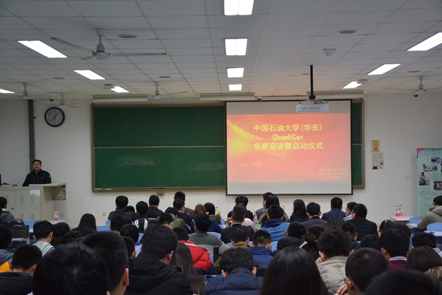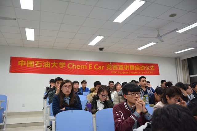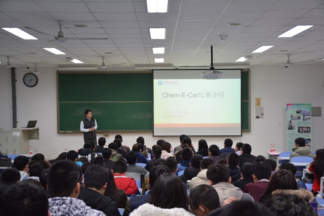 为促进科技育人实效,鼓励学生参与科技创新,从而增强学生创新精神和实践能力,3月4日晚,由化学工程学院主办、我校AIChE学生分会和化学工程学院科技协会共同协办的Chem-E-Car比赛启动仪式暨比赛动员会在南教201拉开帷幕,化学工程学院副院长黄方、党委副书记王迅,AIChE学生分会指导教师刘义、Chem-E-Car竞赛指导教师金鑫、化工学院全体辅导员,以及来自化工、安全、机电、信控等不同专业的近百名同学参与了竞赛启动仪式。