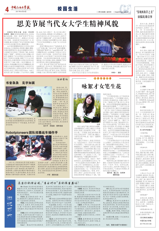 由中国汉服博物馆馆长王忠坤主讲的思美论坛之汉服讲座,将袄裙、襦裙、儒服、经典汉服带到学生身边并讲解相关知识,让姑娘们对汉服有了更深的了解,也深深地爱上“国服”。将传统文化的元素融入思美节,既激发了学生对传统文化的热爱,也提升了校园文化底蕴,展现了石大女生的青春风采;在理学院和文学院共同举办的思美节手工DIY大赛上,来自叶雕协会、书法协会、玲珑蛋雕社的女生们精雕细刻,展现着女生独有的细腻和柔情,让同学们在动手怡情的同时,发现生活的美,寄予对美的向往;由化工学院主办的“ChemGirl之迷失的元素“活动融入了化学知识,集趣味、运动、知识、团结于一身,充分显示理工科女生的特色,展现着大学生积极向上、团结协作的风采;在大学生活动中心报告厅进行的“巾帼辩论赛”,正反方辩手们激烈的争论,对网络红包的利弊作足分析,提高了学生们的思辨能力,丰富了女大学生的课余生活。
