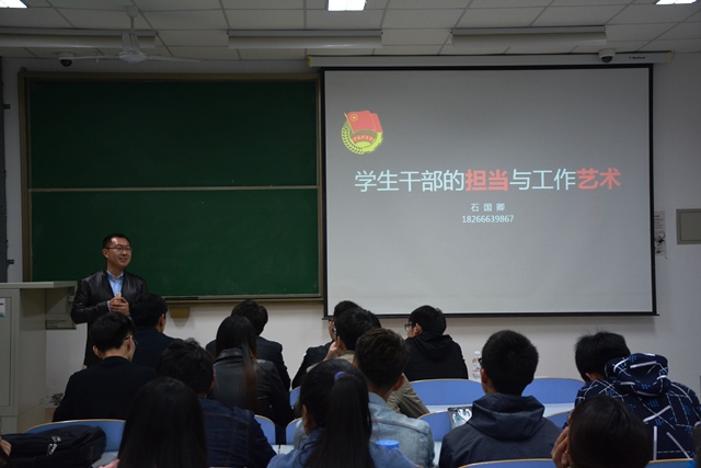 会议开始,石国卿作题为“学生干部的担当与工作艺术”的演讲。他从自身出发,结合自己做学生干部及辅导员的每段经历,讲述了优秀学生干部应该具有的一些品质,石国卿提到:“学生干部的优秀品质可分为两个方面,一方面是与生俱来的,这部分外在条件是强求不来的。而另一方面,就是后天的积累,成绩好、品行好、乐于助人、善于沟通、富有责任心等,这部分往往才是我们应该去努力实现的。”