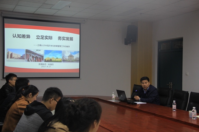 会上,姚海田作了题为《认知差异 立足实际 务实发展》的报告。首先他从高等教育国际化的现状谈起,介绍了我们学校“走出去”和“请进来”所取得的成绩,并结合他个人在加拿大阿尔伯塔大学的学习调研经历,引出了本次论坛的主题——正确认识中西方学生教育管理工作的差异。