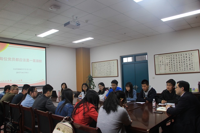 4月19日下午,化研1604党支部在工科楼A座院会议室举办了主题为“每一位党员都应该是一面旗帜”的学习研讨会,学院党委副书记王迅作为联系支部的教职工党员受邀参加。党支书陈雅琪主持会议,支部全体党员参加会议。