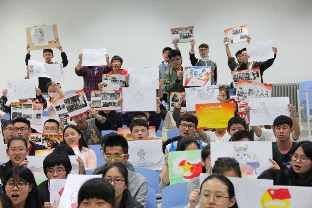 活动伊始,陈兆辉老师介绍了本次活动所需画作的要求,倡导同学们认真思考,积极动脑,紧密结合中国共青团成立95周年以来在作品中充分地展现当代青年学生的朝气与活力。随后学生们积极行动起来,伴随着大家激烈的讨论声音,各种构思浮现在学生们脑中,先描线,再上色,很快一幅幅栩栩如生的画作呈现在大家眼前,有鲁迅的肖像,有团的标徽,有长城、有国旗,最令人印象深刻的还属习近平主席推行的“那年那兔那些事”。活动最后,各参赛选手上台与其作品合影。