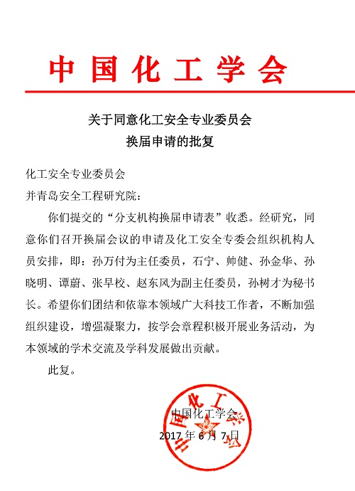 批复指出,同意化工安全专业委员会召开换届会议的申请及化工安全专委会组织机构人员安排。其中孙万付为主任委员,赵东风、石宁等7人为副主任委员。同时要求化工安全专业委员会团结和依靠本领域广大科技工作者,不断加强组织建设,增强凝聚力,按学会章程积极开展业务活动,为化工安全领域的学术交流及学科发展做出贡献。