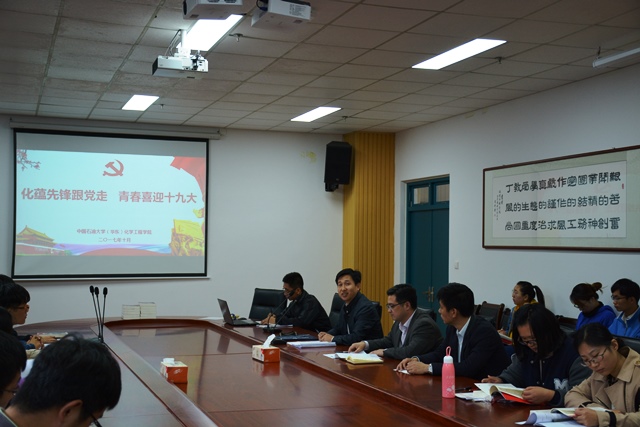 中国共产党第十九次全国代表大会将于10月18日在北京召开,这是全党全国各族人民政治生活中的一件大事。为引领全体学生党员听党话、跟党走,以奋发向上的精神状态迎接党的十九大,以高度的思想和行动自觉学习贯彻党的十九大,10月11日,化学工程学院在工科楼A座报告厅举行“化蕴先锋跟党走•青春喜迎十九大”系列活动启动暨《习近平的七年知情岁月》授书活动。组织部温胜利老师应邀出席活动,学院党委副书记王迅、全体辅导员以及学生党支部书记参加了此次活动。