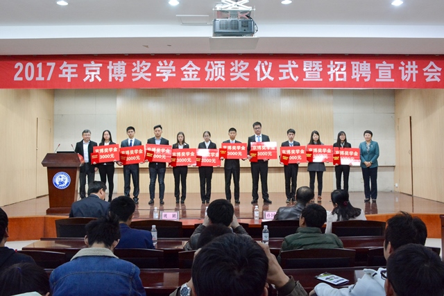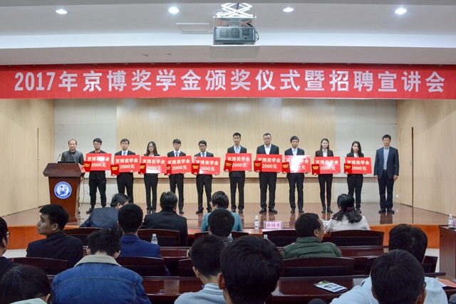 11月10日下午,2017年京博奖学金颁奖仪式在逸夫楼一层报告厅举行。会议由我校化学工程学院院长杨朝合主持,山东京博控股股份有限公司技术中心副主任、青岛研发中心主任姚刚和我校副校长张玲玲出席并致辞,京博商校校长助理、合作发展部部长孙国勇,黄河三角洲京博化工研究院有限公司总经理助理、总经理办公室经理靳继超,我校党委学生工作部部长姚海田,党委研究生工作部部长吕宏凌,学生就业指导中心主任王林,合作发展处副处长张炜出席会议。