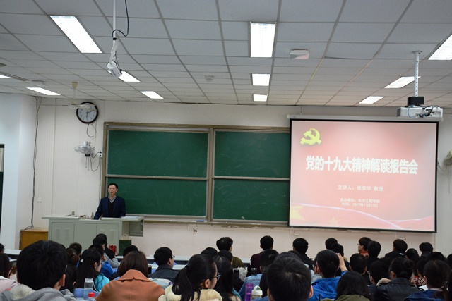11月12日,化学工程学院在西环101教室举行党的十九大会议精神解读报告会。此次报告会由马克思主义学院张荣华教授主讲,向全体学生党支部书记、本科生党员及研究生2016、2017级党员介绍了党的十九大会议报告的具体内容和深刻内涵。