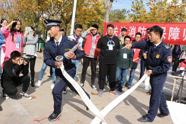 活动过程中。志愿者针对学生群体开展了紧贴宿舍用电问题的消防问卷调查,并进行了消防知识的介绍和消防知识宣传手册的发放。同时,保卫处消防科物业消防队队长孟昭龙向学生介绍了基本的消防知识和应急处理方法。紧接着,孟昭龙就灭火器、消防水带、消防斧等消防器材进行了原理说明、使用介绍和操作演示。期间,10数位学生上前体验了灭火器的操作使用。
