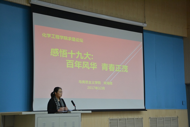 为了推动师生深刻领会党的十九大精神,引导青年一代响应党的号召,不忘初心、牢记使命,12月2日,化学工程学院在南教100举办“感悟十九大:百年风华青春正茂”主题讲座,邀请马克思主义学院马克思主义中国化系主任、党支部书记宋海儆副教授与学院师生共同感悟党的十九大精神。学院党委副书记王迅、全体辅导员、学生干部代表、入党积极分子参加本次讲座。