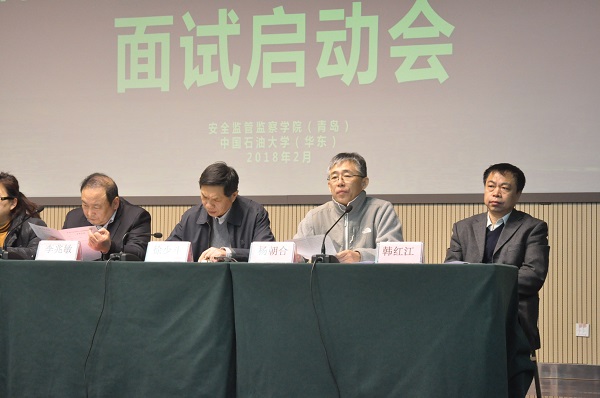 招生面试启动会由安全监管监察学院(青岛)专家委员会主任暨安全环保与节能技术中心主任赵东风主持,国家安全监管总局三司副司长徐少斗、副校长李兆敏、化学工程学院院长暨安全监管监察学院(青岛)院长杨朝合等出席并讲话,国家安全监管总局安全监管监察学院(青岛)、研究生院、化学工程学院和教育发展中心相关负责人,面试专家团队和全体考生参加。