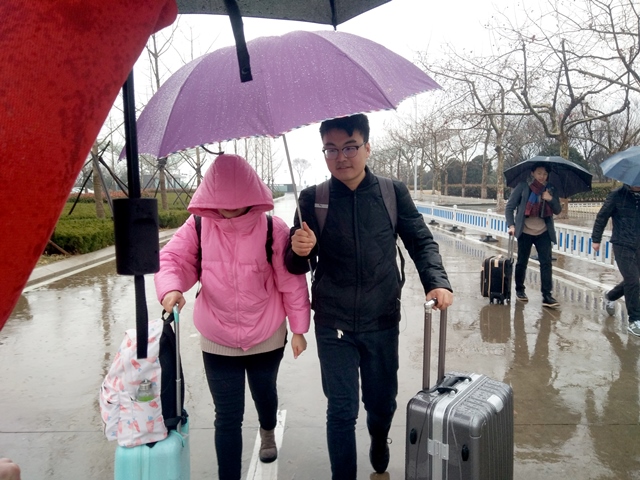 学生冒雨返校