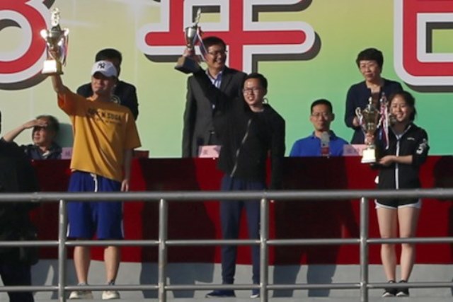 葛毅凯同学代表学院领学生甲组男子团体第二名奖杯(中间)