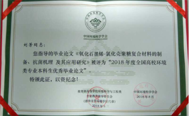 本次评选工作是由教育部高等学校环境科学与工程类专业教学指导委员会与中国环境科学学会联合组织,面向全国环境科学与工程类专业的本科毕业生征集作品,包括环境科学与工程、环境工程、环境科学、环境生态工程、环保设备工程、资源环境科学、水质科学与技术等专业,目的是为不断提高环境科学与工程类专业本科生培养质量,提高学生理论与实际相结合和解决复杂环境问题的能力,为我国环境保护事业输送更多高质量人才。经专家组初审、复审和终评,最终评出60篇“2018年度全国高校环境类专业本科生优秀毕业设计(论文)”作品,其中优秀毕业设计24篇,优秀毕业论文36篇。由我校报送的毕业论文《氧化石墨烯-氯化壳聚糖复合材料的制备、抗菌机理及其应用研究》,荣获优秀毕业论文奖。