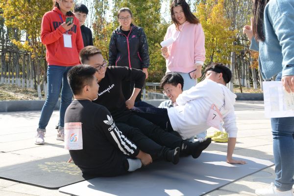 本次训练营开营仪式流程分为三个流程,分别是团队建设、大型素质拓展活动——精英挑战行、团队大比拼。开营仪式活动首先在团队文化建设活动中拉开序幕。全体参与者热身慢跑10分钟,之后半小时内,众团队集思广益,绘制队旗,讨论队伍名称、口号等,各小组进行团队文化介绍,介绍结束后进行了绑腿跑活动,各个队伍为了争夺第一认真准备,虽然在绑腿跑中有一些同学摔倒了,但是他们感受到了团结的魅力。在团队建设活动结束后,进行的是“精英挑战行”素质拓展活动,校园素质拓展活动包括心有灵犀、鸡毛送信、体能接力、情同手足、企鹅漫步、学海畅游。不同的活动分在校园不同的位置,队员们在校园中奔跑于不同的活动项目场地之间,在完成活动中团结一致,在游戏与挑战中体会团结的力量,增强了团队的战斗力和凝聚力。压轴环节进行团队大比拼,活动分为单腿搭肩跳和happy together,每一位队员都参与其中,并为了团队取胜献出自己的力量,最后由第十队摘得了冠军。