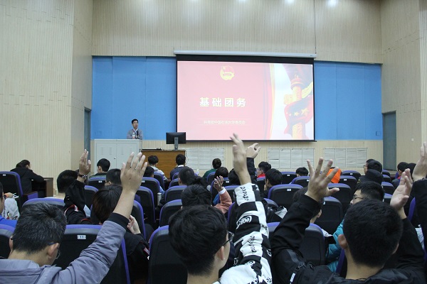 本次团课,郭孟从七个部分为学生们介绍基础团务。首先,郭孟从共青团的职能、共青团的组织、共青团的历史三部分为学生们普及团史团情的有关知识。他具体讲解了共青团的构成、性质以及发展历程,并对青年团员提出了“新时代,新担当,新作为 ”的奋斗目标。其次,郭孟从共青团干部的人生意义和特点、含义地位和作用两方面展开讲述,他指出,团干部在团组织中有着举足轻重的地位,历来受党的重视,在社会也有举足轻重的地位。他提议学生兼职团干要“明确崇高的追求和坚定的理想信念,培养无私奉献和顽强拼搏的精神,增强为人民服务的责任和意识”。随后,郭孟从共青团改革、团的基层组织的基本任务、团的组织生活、主题团日三方面介绍了基层团支部书记的工作职责。他对团员发展问题以及举办主题团日活动给出建议。他表示,希望共青团员能做到“强三性,去四化”。最后,郭孟对共青团干部的素质和能力提出要求,最后,郭孟以习近平总书记的赠语“要爱国,忠于祖国,忠于人民;要励志,立鸿鹄志,做奋斗者;要求真,求真学问,练真本领;要力行,知行合一,做实干家”勉励青年团员。