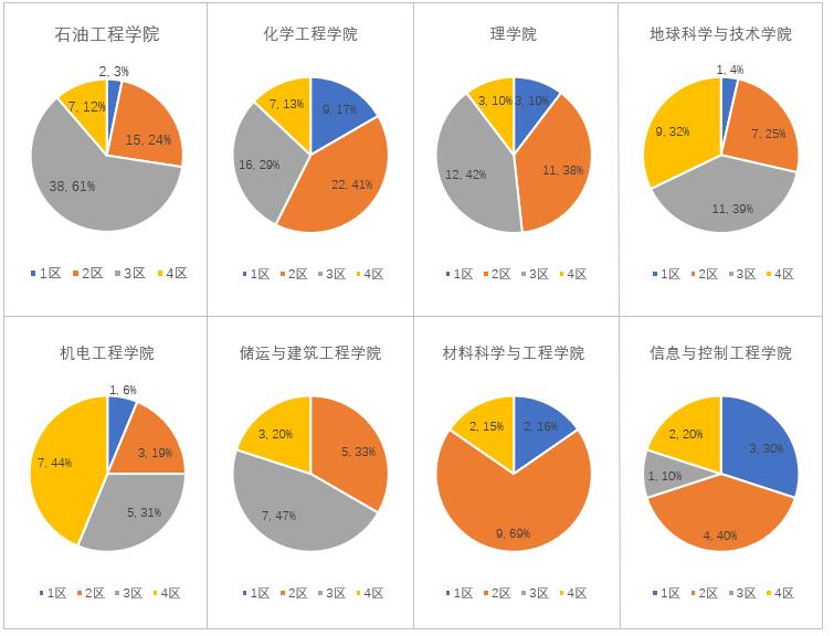 图中数字为论文篇数,占比。例如石油工程学院1区论文2篇,占比3%