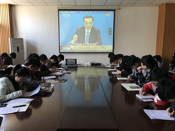 2019年3月5日,第十三届全国人民代表大会第二次会议在北京开幕。3月15日,国务院总理李克强在北京人民大会堂会见采访十三届全国人大二次会议的中外记者并答记者问。3月17日上午,2016级本科第一学生党支部和第二学生党支部组织支部全体党员于工科楼A119会议室观看总理答记者问,现场交流体会。
