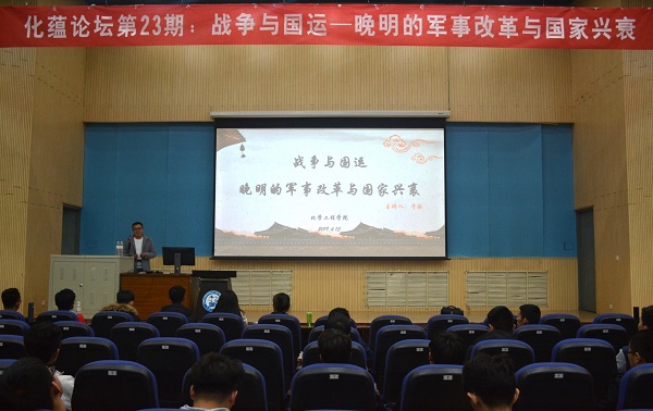 为帮助学生深入了解晚明历史,把握晚明的历史动态,4月13日晚,化学工程学院于南教100报告厅开展主题为“战争与国运—晚明的军事改革与国家兴衰”的第二十三期化蕴论坛。本次论坛由马克思主义学院于泳老师担任主讲,主持人孙畅及三百余名学生参加。