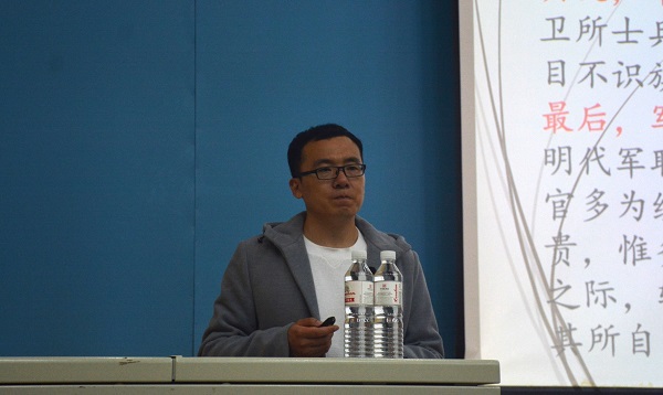 讲座伊始,于泳以书籍《明朝那些事儿》引发学生对明朝历史的回忆。他分别从时易世变、强敌四环、划疆自守等七个方面向学生讲述晚明的国际战争与东亚格局。随后,结合地图,从地理因素上分析明朝划疆自守,不事远图的原因,指出中国拥有的自给自足的能力和良好的地形因素导致了明朝做出严格限制对外经济、文化和科学等方面的交流这一决定。紧接着,他向学生讲解晚明军队出现的问题,他提出,火器的局限性,军队体制和军官队伍存在问题是导致明军不堪大任的主要原因。随后,他详尽的讲解了晚明的四场大战并且针对晚明的军事改革运动向学生讲述改革中在兵器和士兵方面做出的改变。最后,于泳与学生们探讨了明朝灭亡的原因,指出历来文人对宦官的评价不可能绝对客观,对宦官机制于明朝维持权力分衡的积极意义表示肯定,并重点强调了经济因素在明朝覆灭中产生的重要作用。