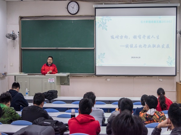 讲座伊始,赵剑从自身工作经历为切入点,引发学生对于日后择业方向的思索。他指出:每个人毕业后将会面临待选择的道路,但是如果每一步路有更多的经验积累与指点,结果会有很大的不同。随后,他又就目前许多大学毕业生求职过程中面临的困境进行了分析和讲解,指出当代毕业生就业存在目的过于清晰,与实际脱节过大等诸多问题。赵剑以中化泉州石化为例,介绍了现在石化行业职业发展的前景、先进炼化企业的真实面貌、以及石化行业职业发展的通道渠道等。最后,他提醒大家要抓住时代发展的机遇,因为做一件事最好的时机是十年前,其次是现在。要以终为始,永远不要忘记自己的目的,手段必须为目的服务。要认识到你的唯一竞争力就是专注。讲座最后,赵剑和现场同学进行了互动交流,大家也纷纷就自己感兴趣的职业选择、发展以及薪酬待遇等方面进行了提问交流。
