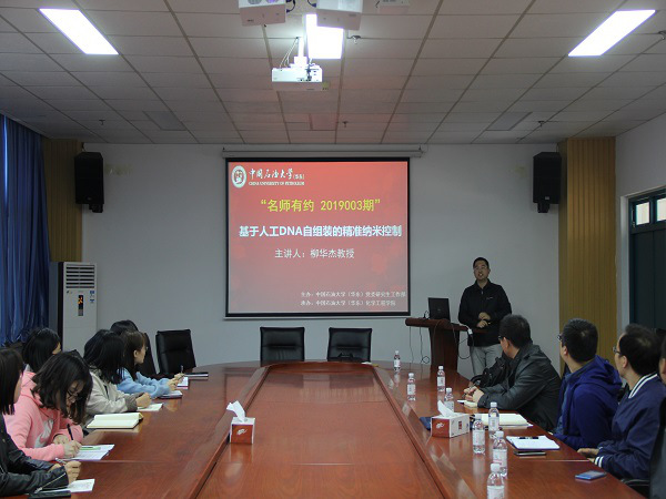 柳华杰教授交流的主题为“基于人工DNA自组装的精准纳米调控”,报告中,他从两个主要方面就DNA自组装的精准纳米调控展开讲解。柳华杰研究发现,基于具有分子水平精准性的DNA碱基配对原理,通过程序化自组装"自下而上"构建纳米结构与器件,并进行性能的精确调控,这为探索精准纳米制造提供了新的思路。随后,他就如何利用DNA折纸术模板定位组装大粒径纳米金颗粒,如何借助DNA自组装过程实现在纳米尺度上对信息处理过程的调控分别进行了讲解。报告会后,应学院青年教师联合会邀请,柳华杰教授与年轻教师就科研、教学成长的心路历程,以及优青等国家人才计划的参与心得,与年轻教师和研究生进行了深入的交流、讨论。