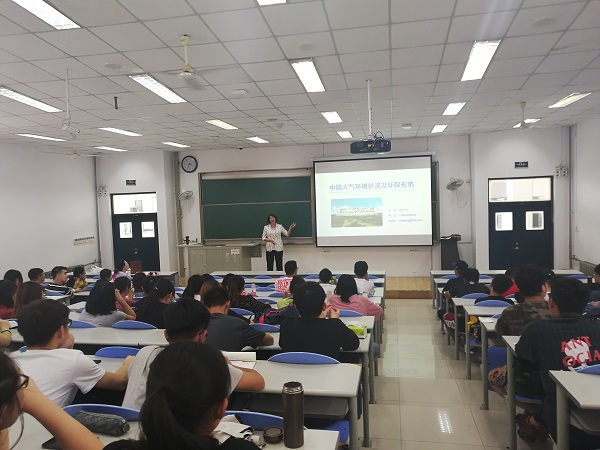 活动伊始,纪欣蕾宣读活动流程。首先,耿春香作以《中国大气环境状况及环保形势》为题的报告,报告中她主要介绍了我国的总体大气状况和环保目标,总结了我国的环保形势——任重而道远,进而她通过展示政府工作报告及相关文件倡导学生积极参与蓝天保卫战。随后,郭孟做出总结和补充,他认为环境保护可分为三个层面:第一层面应从身边做起,在校园中自觉保护环境;第二层面上升到城市及社区,学生应倡导环保理念,保护海洋环境,进而养成社会公德;第三层面是学生应认真学习专业知识,为环保事业做出贡献。最后进行环保知识竞赛环节,到场学生被分为八个小组,对五十个环保题目进行抢答,最终评选出环境1701第二小组和环境1801第二小组为并列第一名。