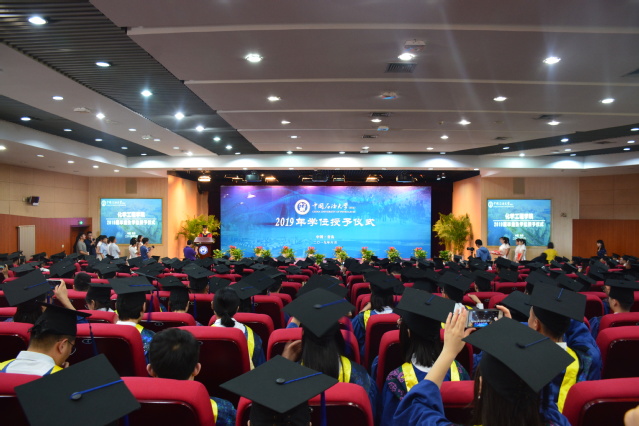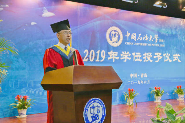 6月24日上午,化学工程学院2019届毕业生学位授予仪式在逸夫礼堂举行。仪式由学院副院长刘欣梅教授主持,学院院长杨朝合教授,学位评定分委员会主席刘晨光教授,副院长刘东教授、蒋文春教授以及环境系赵朝成教授为619名本科生、301名研究生授予学位。