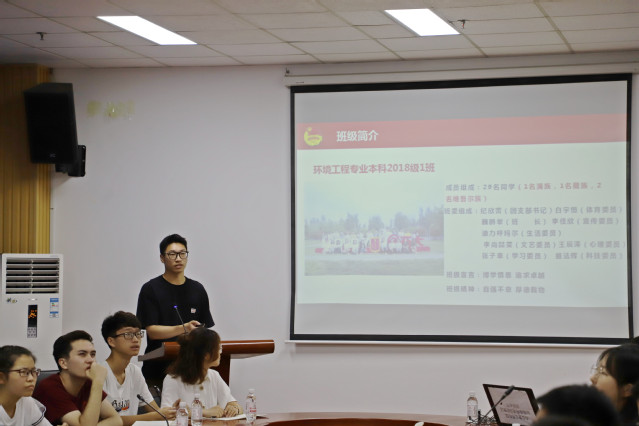 班会由团支书纪欣蕾主持,她为同学们解读了班会主题。班长魏鹏举从成员组成、学风建设、班级活动、取得荣誉等方面对班级进行简单介绍。