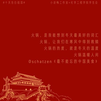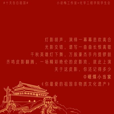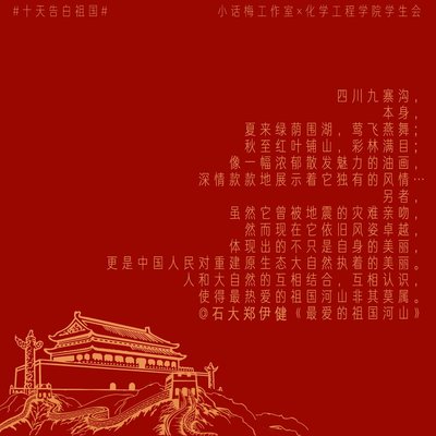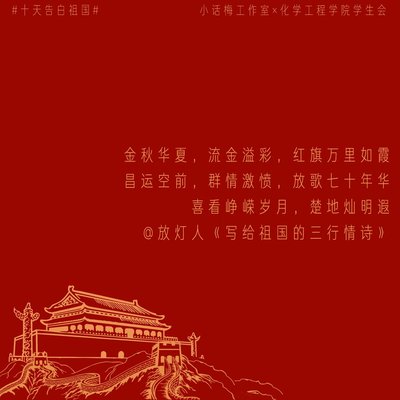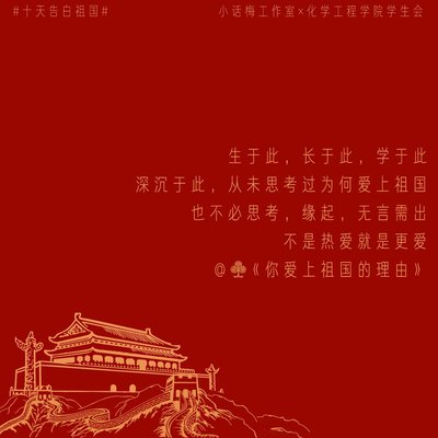 9月20日至9月29日,学院化蕴长江通讯社小话梅工作室发起#十天告白祖国#线上活动,十天十个话题,参与者通过QQ空间、微博等网络平台发表原创短文参与话题讨论,#告白祖国的三行情诗#、#你爱上祖国的理由#、#我与祖国同框#、#最爱的祖国河山#等10个主题吸引了超5000人浏览,学院“缤纷化蕴”微信号进行整合推送,将化院学子的爱国之情通过图片、诗歌、讲述等形式表达。