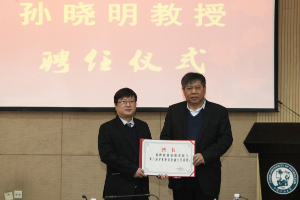 12月2日学校在逸夫楼会议室举行聘任仪式,聘请国家杰出青年科学基金资助获得者、国家“万人计划”科技创新领军人才孙晓明教授为重质油国家重点实验室(华东)主任、校学术委员会副主任,中国科学院院士、校长郝芳为孙晓明教授颁发聘书,会议由副校长操应长主持,副校长姚军参加会议。