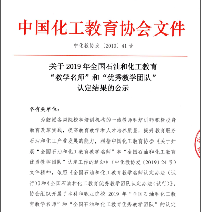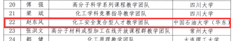 2019年12月5日,全国石油和化工教育“教学名师”和“优秀教学团队”颁奖仪式在浙江绍兴举行。中国化工教育协会于11月18日公布了全国石油和化工教育“教学名师”和“优秀教学团队”的认定结果,认定赵东风教授为“全国石油和化工教育教学名师”,认定赵东风教授带领的“化工安全复合型人才教学团队”为“全国石油和化工教育优秀教学团队”。