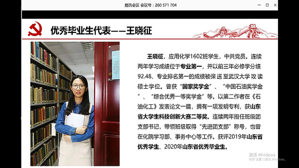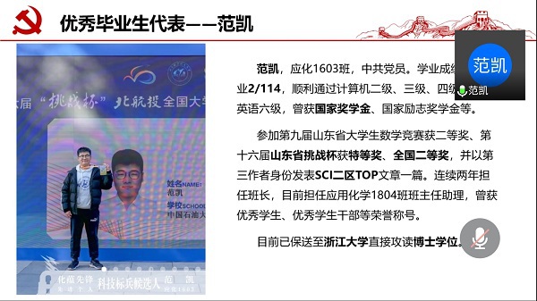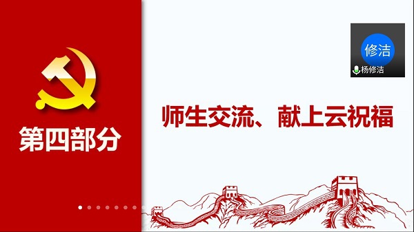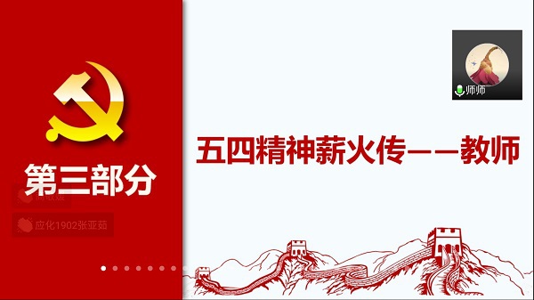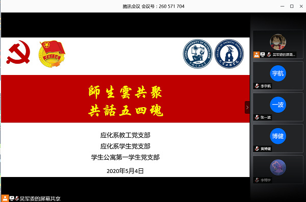在五四青年节到来之际,为弘扬五四精神,更好地发挥高年级学生党员的“传帮带”作用,促进教职工党员与学生党员交流。5月4日上午,化学工程学院应化系教工党支部联合应化系学生党支部、学生公寓第一学生党支部以“师生云共聚,共话五四魂”为主题,通过腾讯会议的形式开展了学习交流,会议由学生党员吴军委主持,各支部党员、预备党员、积极分子参加。