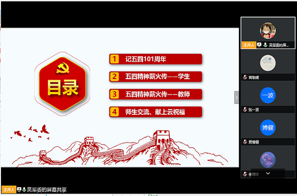 活动伊始,由学生党员吴军委介绍此次组织生活的主题和意义,通过播放《记五四101周年》、《写在2020五四之前---我们还是曾经的少年》等短视频,重温101年前的五四运动。随后,结合此次疫情,支部成员共同回顾了习近平总书记给北京大学援鄂医疗队全体“90后”党员的回信。吴军委谈到:“‘欲知大道,必先为史’。五四运动是旧民主主义革命和新民主主义革命的分水岭。从‘外争国权,内惩国贼’到‘团结起来,振兴中华’,青年运动始终同国家、民族命运紧密相连。”