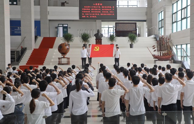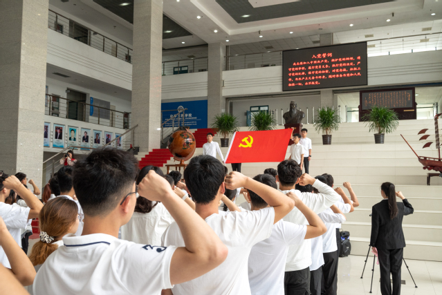 在团委书记郭孟的领誓下,全体新党员面朝党旗庄严宣誓,现场老党员也郑重举起右手重温入党誓词。新党员刘家铭代表学生党员发言,他表示,将强化理论武装,坚定理想信念;将勤于学习,敏于求知,锤炼过硬本领;将脚踏实地,践行誓言,把青春梦融入中国梦,担当青年责任,践行时代使命。