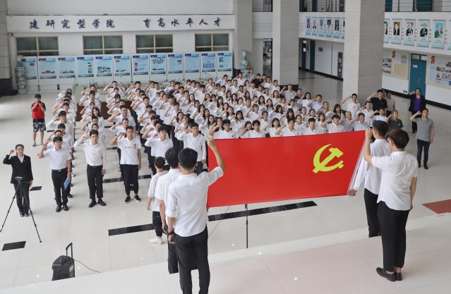 7月1日,在庆祝中国共产党成立100周年之际,化学工程学院在工科楼A座大厅举行新党员入党宣誓大会,共同回顾党的光辉历程和伟大成就,以新党员入党宣誓、老党员重温入党誓词的形式,进一步坚定理想信念,牢记初心使命,引领师生顽强拼搏、不懈奋斗,以优异成绩向建党100周年献礼。学院党委书记李国、副书记王迅,全体教工党支部书记、辅导员、新发展党员以及正式党员代表参加大会。