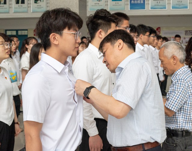 教工党员为新党员佩戴党徽 吴尧摄影