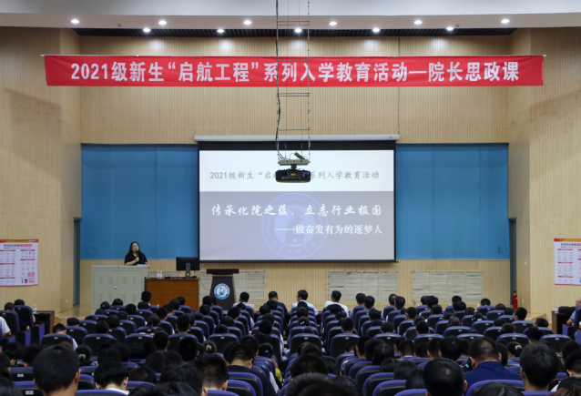 9月23日,化学工程学院2021级新生“启航工程”系列入学教育活动“院长思政课”在南教100开讲。学院院长刘欣梅以《传承化院之蕴,立志行业报国》为题,为全体新生讲授大学第一堂思政课。副院长刘义、各系负责人和教师代表以及年级辅导员出席活动。