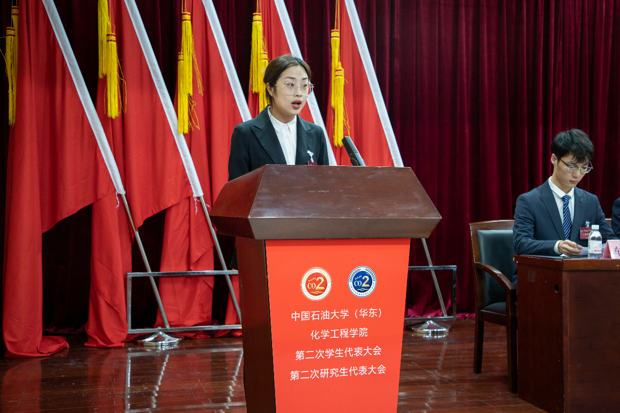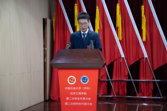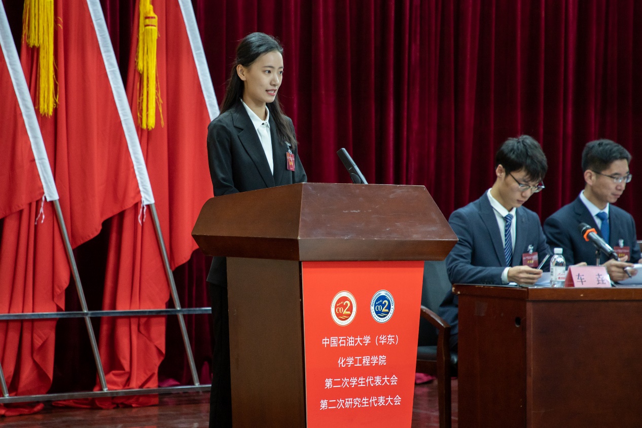 第二次全体会议中,经过主持人王瑜婷介绍选举规则,学生代表依次举手表决通过大会选举办法、总监票人、监票人名单,总计票人以及记票人名单,并由徐庆振宣读中国石油大学(华东)化学工程学院学生会及研究生会主席团候选人名单,进行等额投票选举。