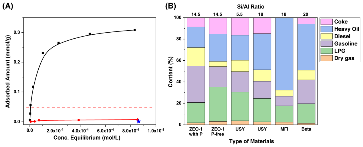 ZEO-1的吸附与催化性能:(A)尼罗红吸附曲线(黑色:ZEO-1,红色:USY,蓝色五星为未煅烧的ZEO-1);