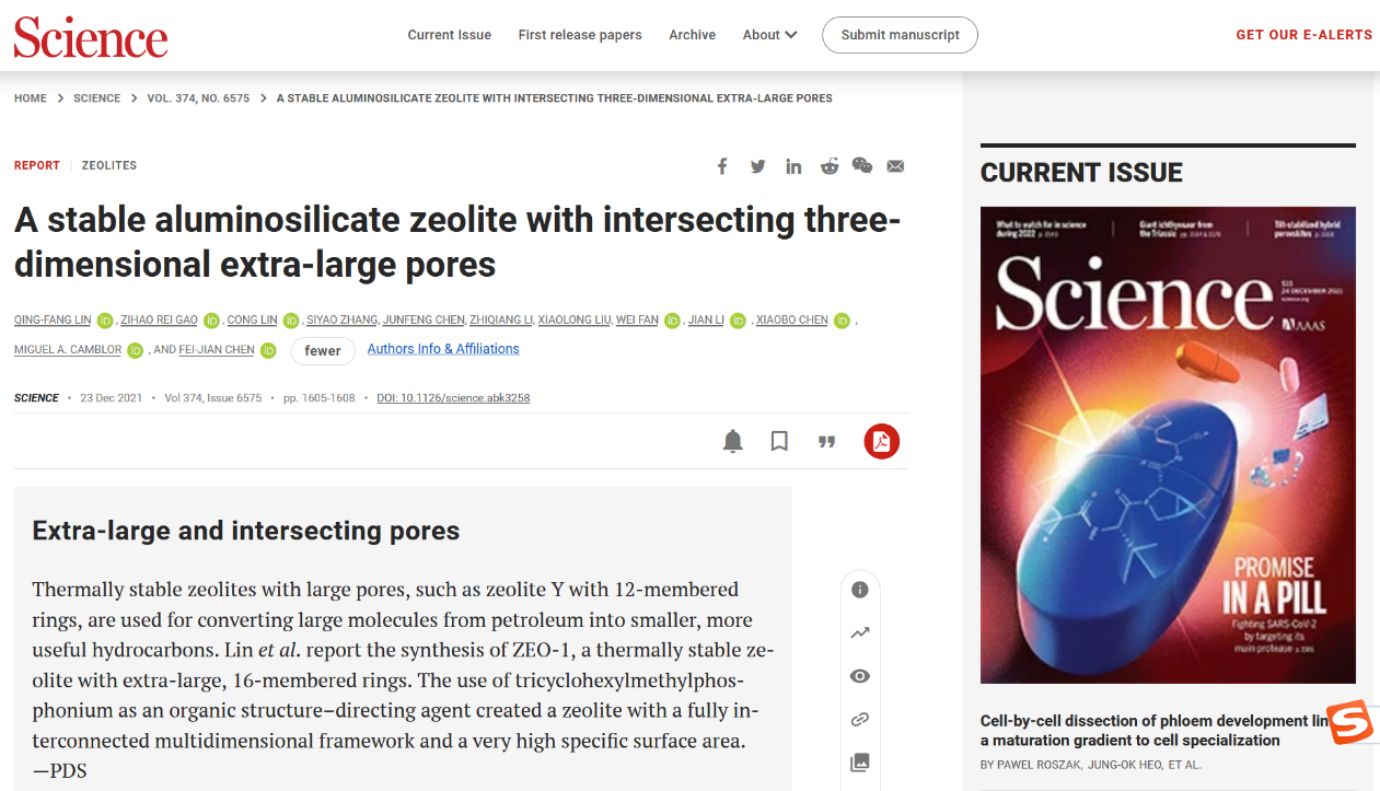 近日,我院重质油国家重点实验室杨朝合教授领衔的催化反应工程团队与蚌埠医学院、北京大学、马德里材料研究所等国内外多所高校和科研机构合作,在具有超大孔道的稳定铝硅酸盐沸石研究方面取得重要进展,相关研究成果《一种具有交叉三维超大孔的稳定铝硅酸盐沸石》(A Stable Aluminosilicate Zeolite with Intersecting Three-Dimensional Extra-large Pores)在线发表于国际顶级期刊《Science》上。团队核心成员陈小博教授为共同通讯作者,化学工程与技术专业2019级研究生陈俊峰、李志强参与论文研究并署名。yl6809永利检测中心为共同通讯单位,这是我校首次以通讯单位在《Science》上发表研究成果。