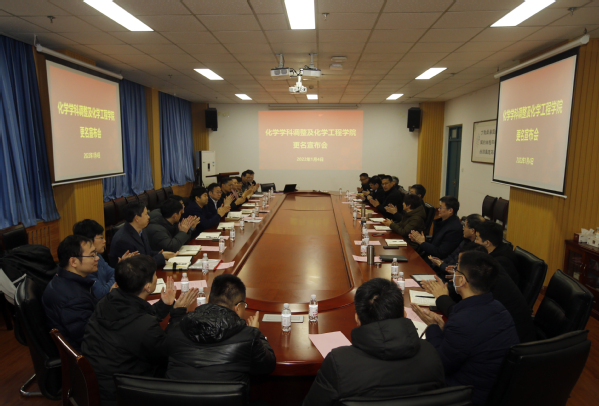 1月4日上午,化学学科调整宣布会暨yl6809永利YL集团更名仪式在工科楼A座121举行。学校副校长操应长,发展规划处处长李贞刚、人事处处长牛庆玮,以及化工学院院领导班子、教授代表参加仪式。