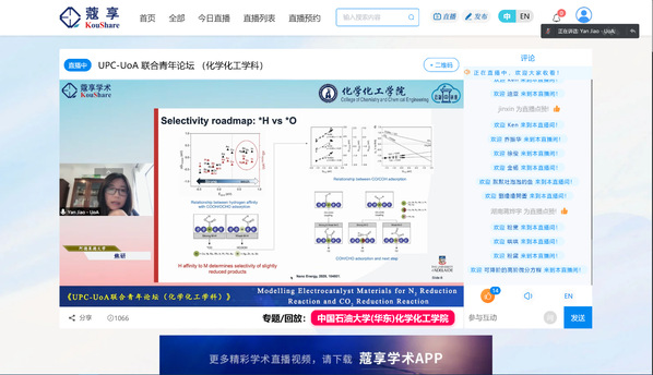 4月10日下午,学院联合联合阿德莱德大学化工学院共同举办了化学化工学科青年学者联合论坛。本次论坛依托学院“云端讲座”平台进行全网直播,累计吸引近5000人在线关注。
