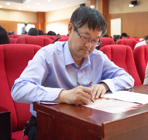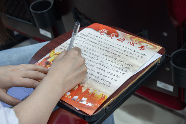 封封决心书,代代化院人。毕业生书写出征决心书是学院六十多年来的优良传统,自1954年以来,每一届毕业生都在决心书上郑重写下对自己、对母校、对党和国家的承诺,一代代化院人接力奋进、踔厉奋发,为祖国建设和能源行业发展贡献了青春力量。在《去西部》《不忘初心》的音乐声中,青年党员提笔静思,在决心书上郑重写下对党和祖国以及母校母院的承诺,嘉宾老师们也为2022届毕业生写下青春寄语。毕业生党员杜洪龙作为代表发言,他分享了自己决心里的青春誓言,希望能够在平凡的岗位上,努力学习,扎实工作,争做行业的先锋者、领头人。
