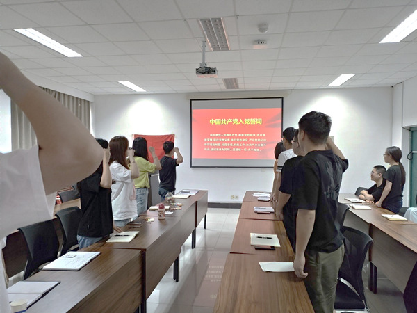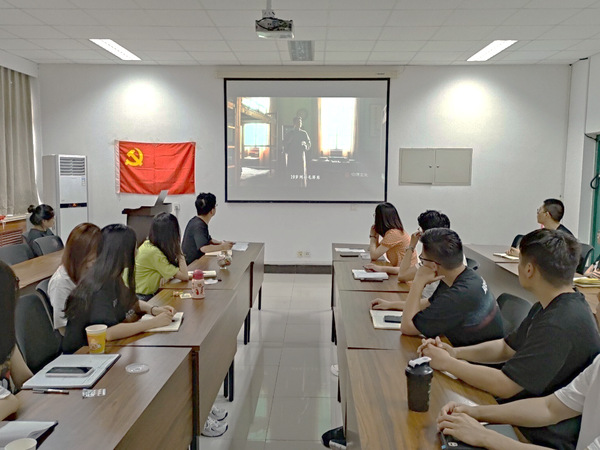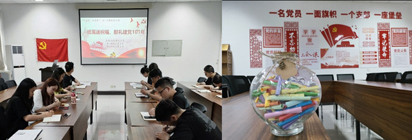 本次主题党日活动由虎祥同志主持,活动包括三项议程:观看党史纪录片;支部党员、积极分子书写对党祝福;支部党员集体重温入党誓词。活动首先观看了党史纪录片《重生》,该纪录片以情景再现的形式,还原了我党在不同历史时期的重大决策、重要事件,再现了我党在绝境中凭借信念和精神的力量获得重生的艰难历程。通过观看党史纪录片,回顾了中国共产党的革命历程,切实感受共产党人为救中国不惜流血牺牲的大无畏精神,深刻理解党的崇高理想信念,同时点燃支部党员们对党史知识的学习热情,真正在党史学习中做到增信、明理、崇德,并以此激励广大党员同志牢记初心使命,做好自己的本职工作,为党和人民的事业拼搏奉献,为实现中华民族伟大复兴添砖加瓦。活动过程中,两支部同志也以纸笺为依托,纷纷写下对党的祝福,以表达对党对祖国崇高的敬意和深深地热爱之情。最后,由陈奕彤同志带领全体党员同志重温入党誓词,砥砺前进初心。