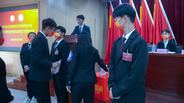 第二次全体会议中,学生代表表决通过大会选举办法、总监票人、监票人名单,总计票人以及记票人名单,宣读了中国石油大学(华东)yl6809永利YL集团学生会及研究生会主席团候选人名单,进行等额投票选举。