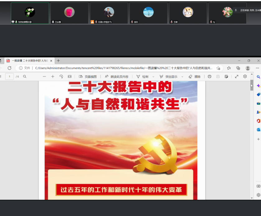 为深入学习贯彻“党的二十大精神”,引导全系教师统一思想和行动,立志做有理想、敢担当、能吃苦、肯奋斗的新时代好青年。12月3日晚,环境与安全工程系党支部以微党课的形式组织开展了“党的二十大精神”专题学习活动。专题学习主题为:推动绿色发展-促进人与自然和谐共生,全系教师参加了线上学习。