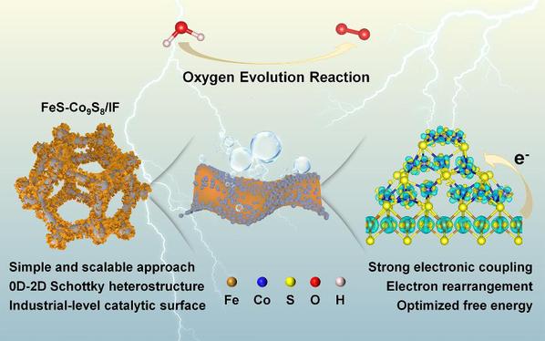 异质结构电催化剂的有效电子和界面耦合是调节析氧反应催化剂的本征活性和稳定性的关键。基于此,团队创新性的制备了FeS-Co9S8肖特基异质结构电催化剂,在工业级的高电流密度下表现出高活性和长稳定性。2D FeS纳米片与其表面分散良好的0D Co9S8纳米颗粒之间的强电子耦合,加速了电子从FeS纳米片中的Fe原子流向四面体位置的Co原子,从而导致异质结构的结构完整以及暴露更多的活性位点。本工作证明了构造肖特基异质结构并使其具有强耦合效应的界面,是获得优异电催化析氧性能的良好策略。