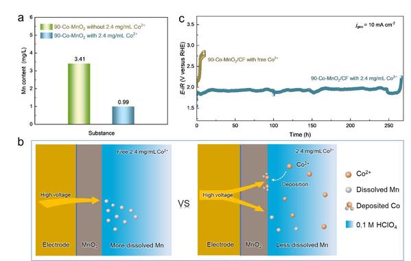 质子交换膜(PEM)电解槽是最具商业化前景的可再生能源电解水产氢装置。但PEM的酸性运行环境使得铱基等贵金属仍旧是阳极(OER)催化剂的主要选择,其储量和价格,却严重阻碍了PEM电解槽应用推广。鉴于此,团队创新性提出了高施加电位与电解液调制相结合的策略,有效实现了丰富的Co物种在MnO2载体表面的沉积,表现出显著提高的酸性OER活性(提升6.9倍)和稳定性(提升46.4倍)。该工作提出的利用Pourbaix图中施加电位与活性元素稳定相的协同因素,为设计酸性介质高稳定电催化剂提供了全新视角。
