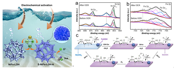 NiFe氢氧化物因其优异活性、可调结构组成和碱性稳定性成为了最具潜力的过渡金属基析氧催化剂。阴离子的精准引入被证实可以调节NiFe活性位点的电荷转移,增强析氧本征活性,同时不破坏其结构稳定性。但如何实现是一个技术上的难点。团队创新性地利用室温吸附和原位电活化相结合的策略,温和地实现了S定量掺杂NiFe氢氧化物的有效构筑。所得催化剂不仅获得了S的高密度均匀掺杂,而且保持了NiFe氢氧化物的形貌结构,提升了活性,保持了高稳定性。同时,相关析氧催化机理也被系统讨论。该工作发表后获得国内外同行关注,相继入选ESI热点论文和ESI高被引论文。
